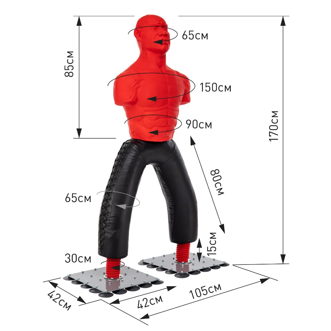 Înălțime: 170-180 cm lățimea umărului: 64 cm lățimea corpului:30 cm lățimea piciorului: 75 cm materialul corpului: silicon materialul piciorului: PVC materialul platformei: Metal. Elementele de fixare cu Velcro sunt instalate sub platforme, care aderă bine la podea. Manechinul este în aer liber pentru practicarea loviturilor. Dimensiuni (LxlxH) 170x105x42cm