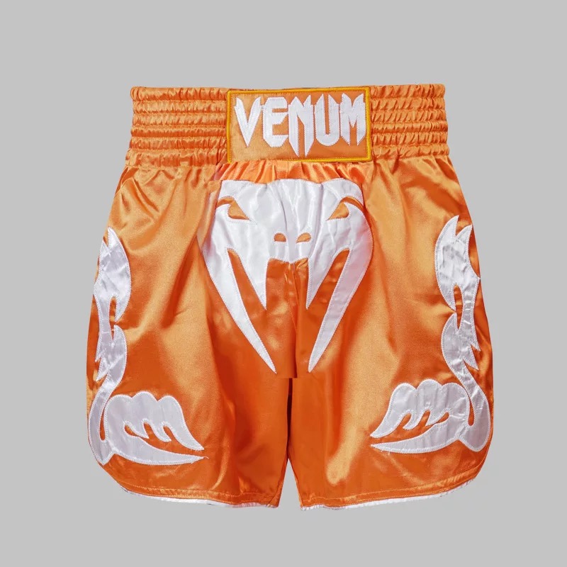 Pantaloni scurți de box și kickboxing Venum Thai, Material: poliester. Culoare: Portocaliu-Alb. Scop: un element al echipamentului unui luptător în boxul thailandez și kickboxing.