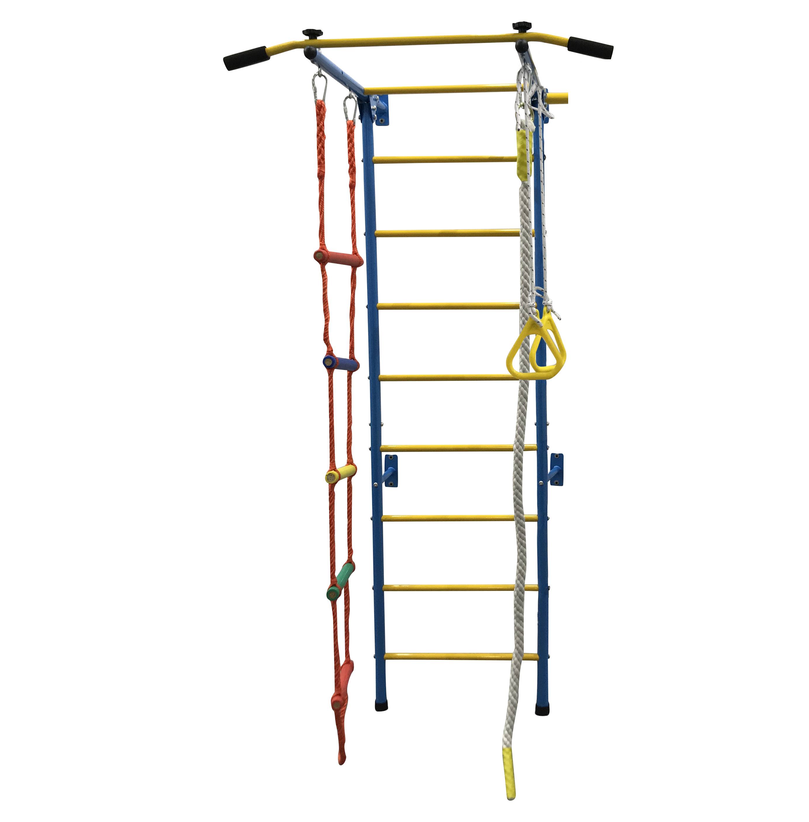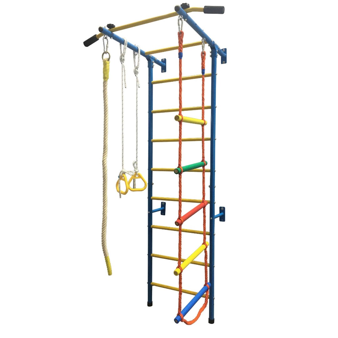 un complex sportiv pentru copii cu bară orizontală, frânghie, inele și perete suedez. Complexul are certificate EUROFINS și TUV.