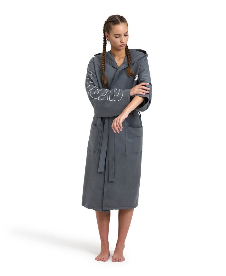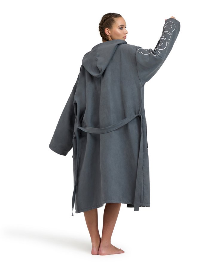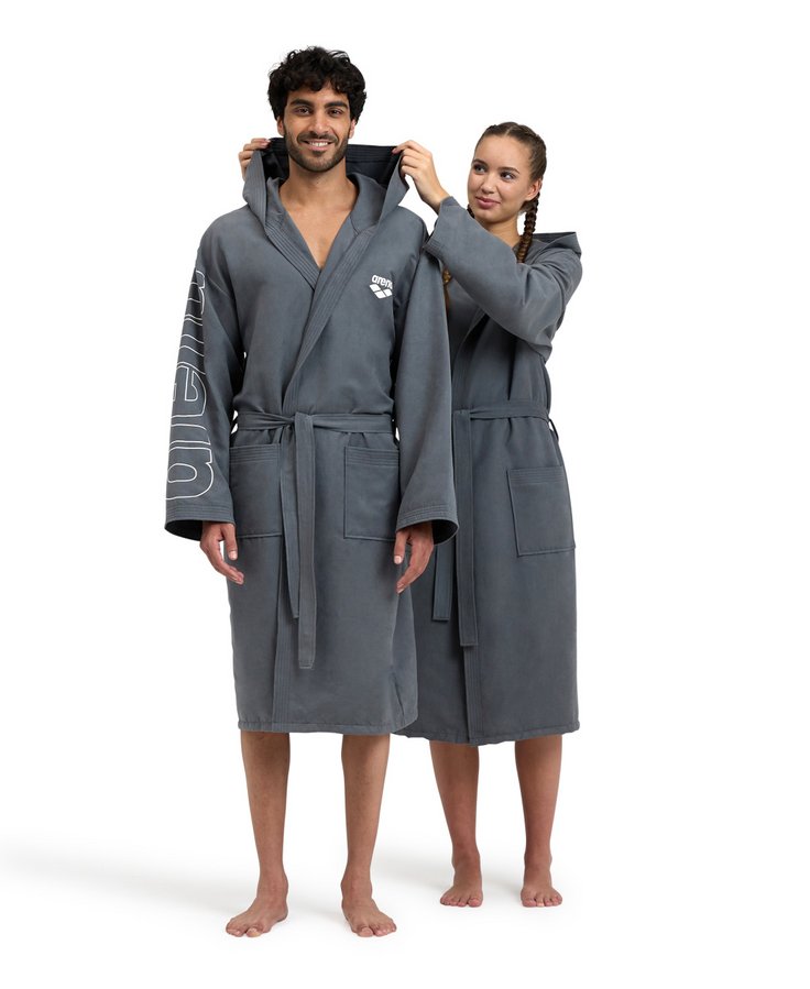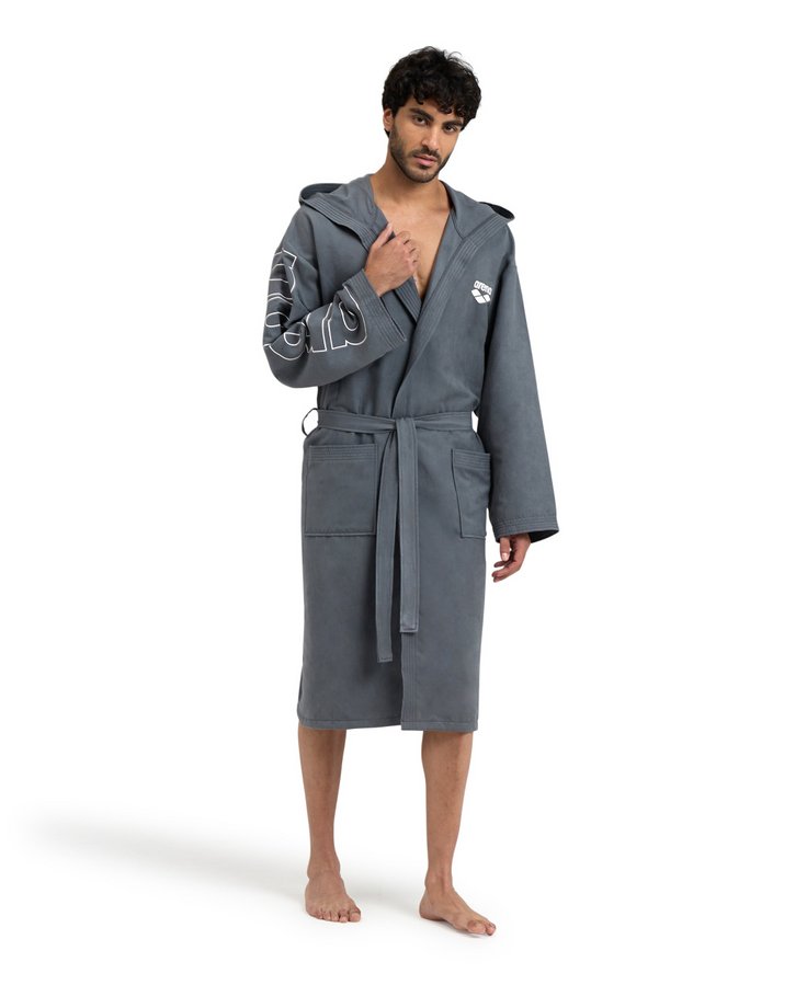 Halat Unisex cu gluga,din material moale si logo-ul Arena imprimat pe piept.Halatul are un cordon pt. talie..Materialul asigura o uscare rapida.