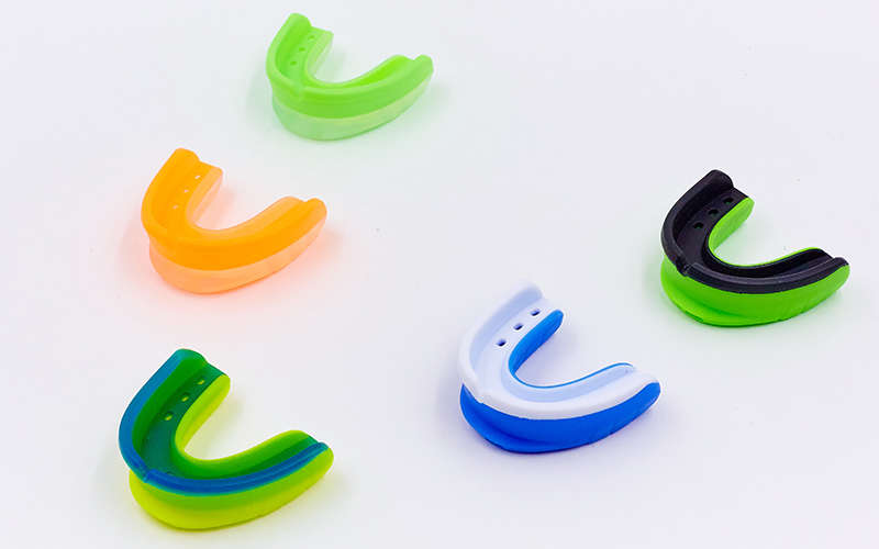 Капа боксерская односторонняя (одночелюстная) двухкомпонентная (термопластик, цвета синий, черный, оранжевый, желтый) в футляре. Размер 5+
