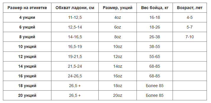 У боксерских перчаток нет традиционных размеров. Здесь используется другая система: есть определенный вес, который измеряется унциями (oz). Одна унц ия – это 28,35 грамм. О чем нам может сказать вес перчаток: 4-8 унций – вариант для детских боксерских перчаток: как для мальчиков, так и для девочек. 10 унций – наилучший выбор для подростков и женщин. 12-16 унций – оптимальные показатели для новичков, поскольку огромные аксессуары хорошо гасят сильные удары и защищают руки от травм. Если вы хотите купить перчатки для профессиональных спаррингов, то при весе в 66 кг выбирайте модели в 8oz, при большей массе тела можно обратить внимание на аксессуары в 10oz.