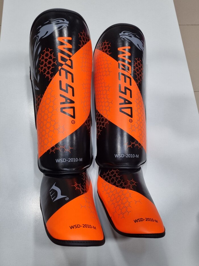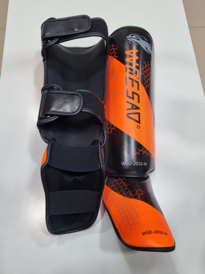 Защита голени и стопы для единоборств SWD, размеры: M-L цвета: оранжевый-черный. Материал Полиуретан (PU)