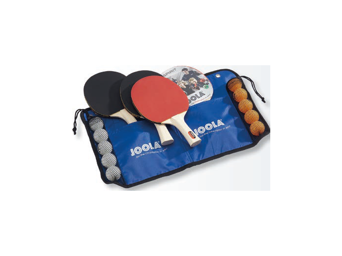 Комплектность: 4 ракетки +10 шариков+сумка синего цвета Накладки шипы внутрь. толщина губки 1,2 мм Назначение: для помещения, новички Ручка: вогнутая Скорость: 60 Вращение: 75 Контроль: 90 Производитель: Joola (Германия).