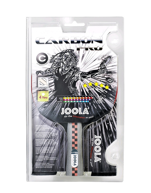 Данная ракетка привлекает внимание любителей тенниса прежде всего наличием конкавной ручки, удобной во всех смыслах. Не меньший интерес вызывает использование для накладки высококачественной резины 4You, одобренной для использования международной спортивной ассоциацией ITTF. В составе ракеток для настольного тенниса Carbon Pro такая резина располагается обязательно шипами внутрь. Между внутренней основой и накладочным слоем обычно располагается губка толщиной 2,0 мм. Основание представляет собой пятислойную тщательно спрессованную фанеру. Кроме того, фанера усиливается защитными карбоновыми вставками. Такая запатентованная технология носит название CARBOWOOD. Конкавная форма ручки обеспечивает максимальный эффект взаимодействия. Вес готового изделия составляет 174 грамма. Технические характеристики ракетки для настольного тенниса класс C таковы: скорость движения мяча достигает 98 процентов — максимально возможная отметка. Кручение возможно на уровне 92 процентов, максимальный контроль мяча равен 86 процентам. Изделие всегда в наличии в каталоге компании Joola. Производитель: Joola (Германия). Компания Joola начала свою деятельность в 1952 году, и с тех пор считается лидером мирового рынка по качеству производимой продукции. За годы своего существования она прочно укрепилась в своих продажах товаров для настольного тенниса. Управленческие функции в компании, взял на себя Михаэль Бахтлер в 1973 году, поскольку обладает обширными знаниями и имеет большой опыт в этом виде спорта. Именно его Интернациональное сообщество индустрии настольного тенниса выбрало на должность своего президента. Компания Joola неоднократно получала награды за свои разработки и отменное качество производимой продукции. Множество из новинок товаров, перенимают другие компании, что только подчеркивает уровень качества Joola. На сегодняшний день торговая марка Joola, имеет представительства в 30 странах, а товары экспортируются более чем в 55 стран по всему мир